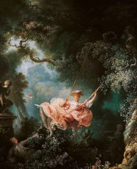 《秋千》一画描绘的是浮华贵族少年藏在树丛里偷看小姐荡秋千的场景:这时秋千上的小姐一只高跟鞋不慎脱落并甩了出来,这位浪荡公子准备伸手去接。尽 管画得十分细致,比如,花园的景色与树丛画得很美,画意的格调却有些艳俗。这幅画代表了当时贵族的艺术趣味。以调情为内容,在弗拉戈纳尔的全部作品中占有 一定优势,而且无论从内容与形式上看,比起他的老师布歇来,则有过之而无不及。在为显贵们订购而作的那些幅画上,香艳的氛围表现得非常露骨,轻佻的内容与 高超的色彩技巧,是弗拉戈纳尔继承布歇"向妇女献殷勤"的一种绘画"传统"。