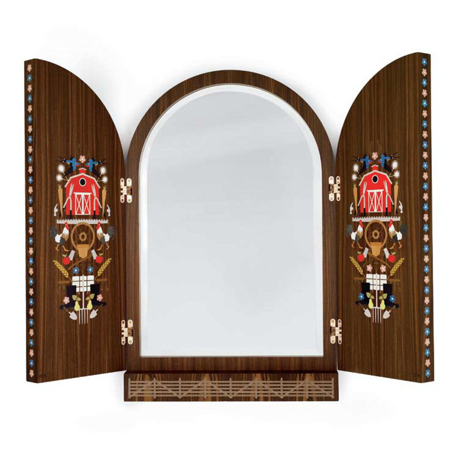 这个相当精致的壁装式巴伐利亚镜子是用印度蔷薇木加工制成的。2008 年的时候,工作室做了一系列巴伐利亚风格的家具,这是其中一件。木头上的镶嵌细工以农场生活为主题。除了镜子之外,这一系列的家具还有橱柜、桌子和屏风。