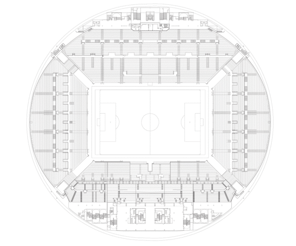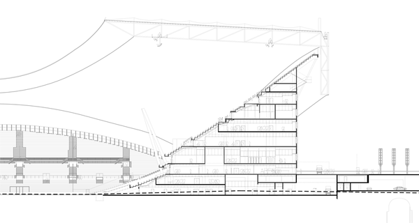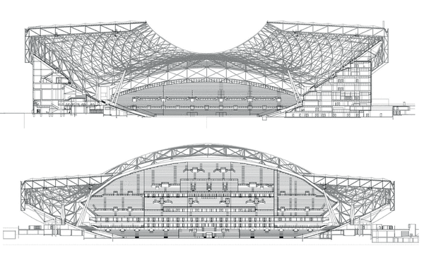 SCAU 被要求为球场增加一个屋顶,给观众一个可以遮风挡雨的地方,同时将观众席从 6 万扩展到 6.7 万个。白色的屋顶沿着已建的座位高低起伏,呈现出波浪的形状。从上往下看能看到像瓦片一样搭建起来的屋顶,有明暗阴影的变化,“就像是一个海边上的贝壳”。