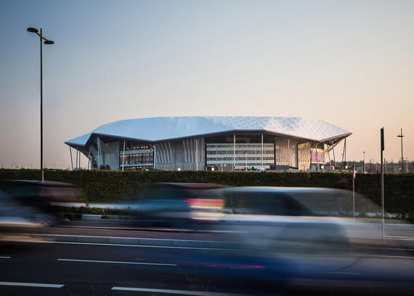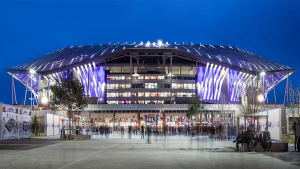 这 座位于里昂的体育馆也被称为“灯光球场”(Stade des Lumières),去年 12 月刚竣工,用来取代建于 1920 年的热尔兰球场。它由伦敦的建筑事务所 Populous 修建,有一个像乌龟壳一样的超大屋顶,可以让减少声音反射,这里举办了欧洲杯的另一场半决赛