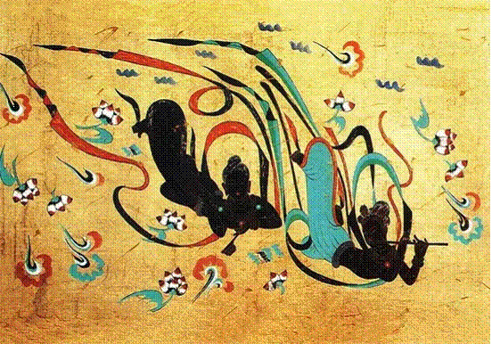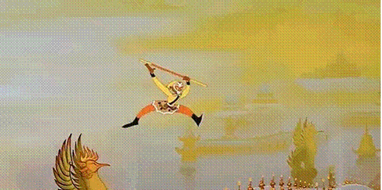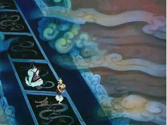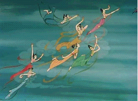 还有很多的细节。比如上图这一幕,是孙悟空“定”住离开的仙女。从衣服的飘带,到动作姿态,再到云纹,都是根据敦煌莫高窟的飞天壁画创作出来的。