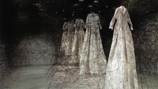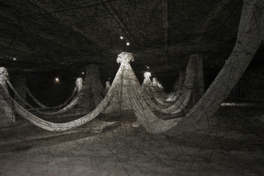 盐田千春是一个行为艺术家也是一个喜欢创造大规模、有特定氛围的装置艺术家。她作品的核心主题是记忆与遗忘、梦与睡眠、过去的痕迹和童年。她最著名的作品 是用黑线在物品外缠绕着不可穿入的网,像是各种家庭、个人和日常物品,如旧椅子,被烧焦的钢琴,婚纱,有时是睡觉的艺术家自己。”迷宫记忆 (Labyrinth of Memory)“(2012)由一系列的礼服和无处不在的线组成--黑色的线--席卷整个画廊空间和礼服。盐田千春说,一条裙子就像人的 “第二张皮”,这在某种程度上 ‘意味着这甚至比我们自己的皮肤更好’,也许会很舒适,也许会令人约束 。利用黑色的丝线,盐田创造出了一种氛围来描述这些矛盾的关系。