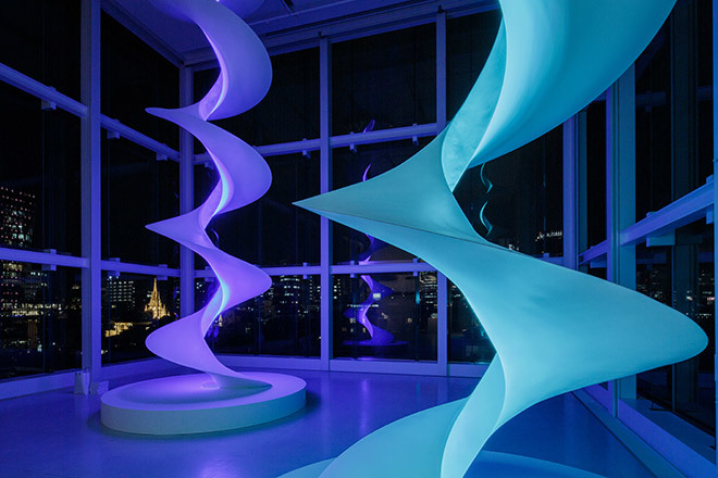 森万里子在2003年在奥地利的布雷根茨现代艺术馆(Kunsthaus Bregenz)以装置作品“Wave UFO”首次亮相。随后,她去到了纽约工作,并还参与了2005的威尼斯双年展。在2010年,通过她在六个大洲的永久性装置作品,她创立了Faou基金 会(Faou Foundation),一个有教育意义和文化的非营利组织。