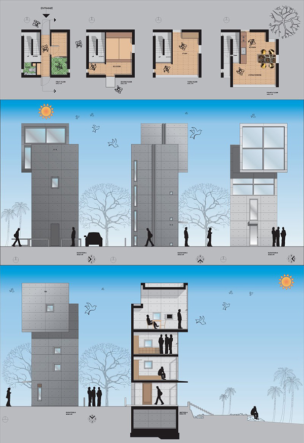 4×4 House共有五层,地下一层作为储藏室,卫生间位于二层,再向上两层是卧室,餐厅起居室位于顶层错位的混凝土方块中。