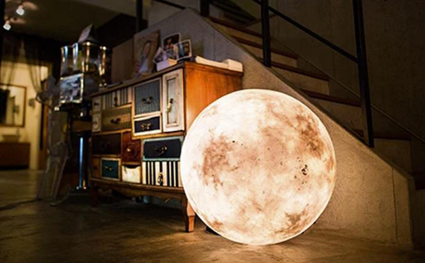 这 款灯看上去就颇有趣味,这不仅仅是灵感来源于月亮,而是复制了一个月球。这款灯由台湾橡果艺术工作室设计,用玻璃纤维打造了一个小型月球,而且球体的直径 从 8 厘米到 60 厘米不等,根据应用地场景不同,可以选择不同尺寸大小的月球灯。比如「大月球」可以作为吊灯,「小月球」可以放在枕边作为夜灯,而且玻璃纤维具有高弹性与 柔韧性,可以直接抱着它感受「月亮」。