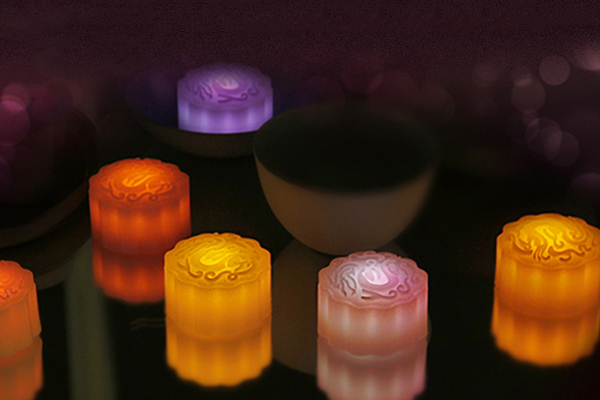 EIS 团队结合月饼与灯,专为中秋打造了这款设计。设计师选择石蜡作为材料,并精心设计了月饼纹路。内部安装有 LED 灯,亮起时,半透明质感,映射在周围的灯光温暖美好。设计师还在石蜡中渗入精油,使灯散发出香味,不同的颜色就对应不同的味道:橙子橘、樱花粉、熏衣紫、 柠檬黄。目前这款月饼灯在光电效应商城有售。
