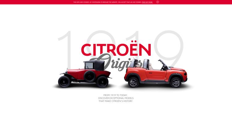 Citroen 的这个页面设计还蛮有趣的,点开就是一个 1919 Citroen 的大 logo,然后会接着出现各个年份的不同车型的 Citroen,来强调品牌的历史。