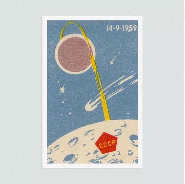 太空竞赛的主题也因为出色的图案设计,淡化了强调国家实力的刻意。比如这张用以庆祝苏联成功发射世界上第一个无人月球探测器 Luna 2 的火花。