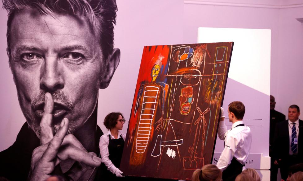 11月10日,已故英国前卫巨星大卫·鲍伊(David Bowie)的私人艺术品收藏首轮拍卖在伦敦苏富比举办,整场拍卖创下了超2400万英镑的佳绩。其中,著名涂鸦艺术家让-米歇尔·巴斯奎特(Jean-Michel Basquiat)创作于1984年的名为《空气动力(Air Power)》的油画,是当晚拍品中最昂贵的一件。该作品加上佣金,总价近710万英镑,是拍前最高估价350万英镑的两倍。在价格达到550万英镑时,这幅拍品的去向曾非常不明朗。一位电话竞标者打电话和妻子商议,是否应该给出更高的价格。最终,这位匿名的竞标人标出580万英镑的价格,但却并没能最后成功摘牌。而当晚的另外一件巴斯奎特作品《无题(Untitled)》也出乎意料的以240万英镑的价格最终成交,是拍前最高估价70万英镑的三倍多。