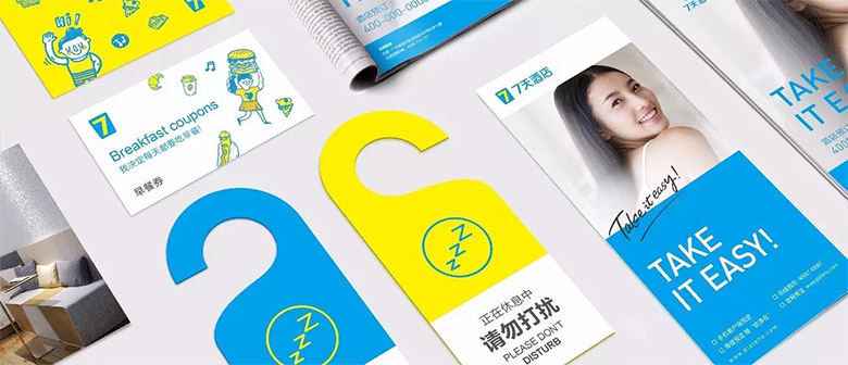 新品牌标识构型变得更加柔和与轻巧,在字体里加入了圆角处理,使用明快舒适的天空蓝与柠檬黄进行搭配,符合国际审美扁平化与抽象化发展方向,同时凸显出7天品牌年轻与活力的个性。清新配色与扁平化设计,表达出新logo的轻盈无负重感,也进一步与全新7天“零负担自由空间”的产品定位相呼应,同时又与全新的酒店设计风格保持了一致,令7天酒店的年轻DNA更加凸显。
