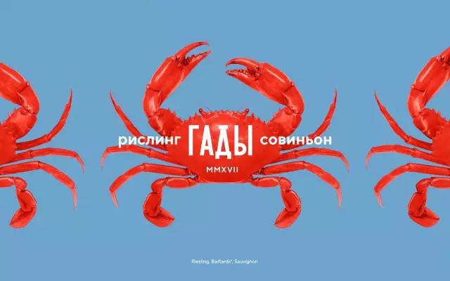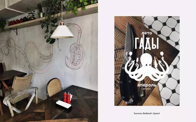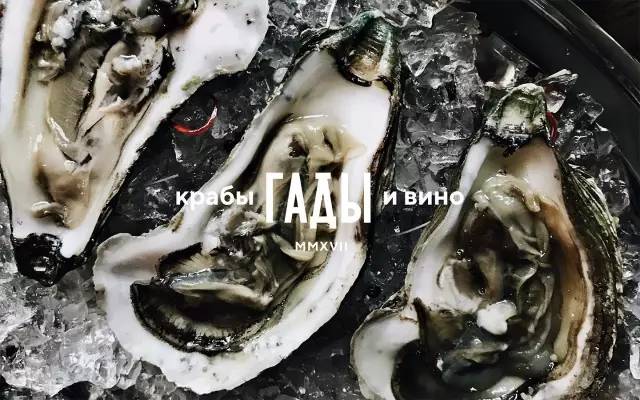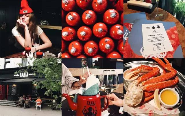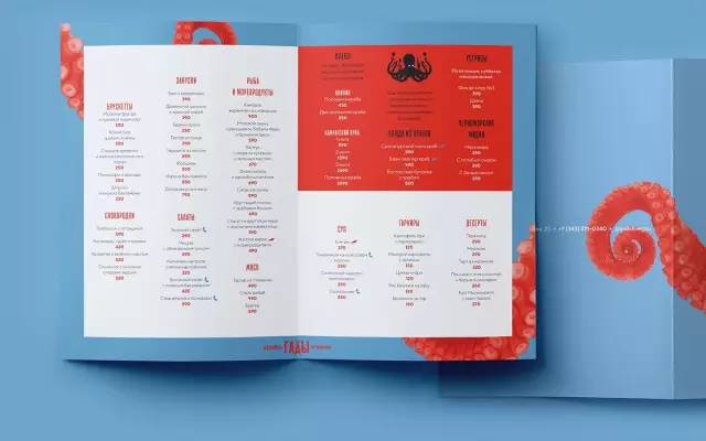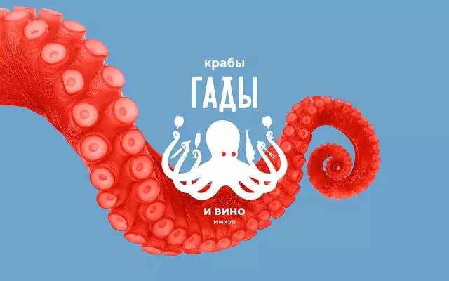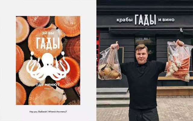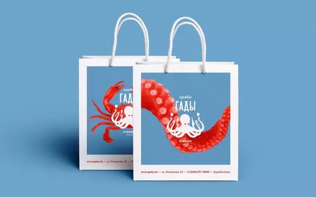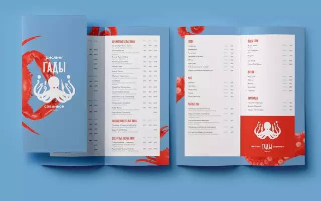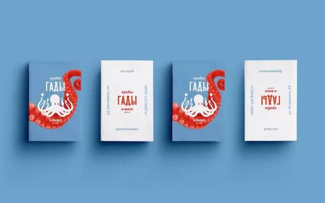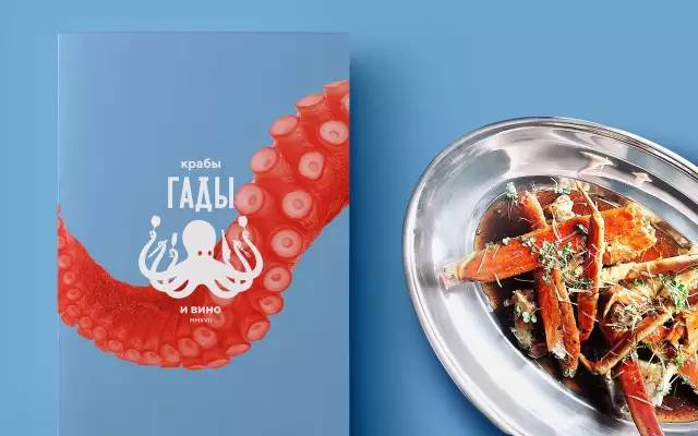 比如俄罗斯一家名 Гады 为海鲜餐厅,Logo 是一只爪握酒杯和刀叉的章鱼,而海鲜烹调之后的红色与水的颜色成为了品牌的主色调。背景搭配让人垂涎的海鲜照片,突出了餐厅的特点也足够时尚。