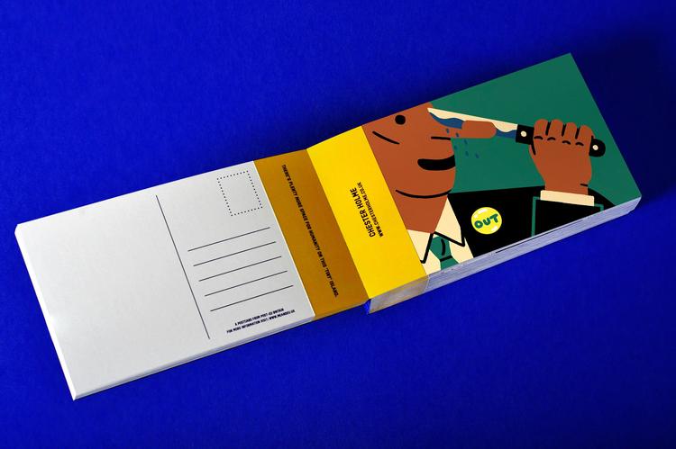 每张正面往往是一副具有讽刺意味的图像,反面则是设计师写给欧盟同伴的话。每张明信片的背面还有来自其设计者的个人信息。目前,收到的 116 张来自创意机构或独立设计师的作品已被集结成两本明信片书。他们既为英国脱欧提供了一个创造性的视觉,也是一个正在转型的国家的一份值得参考的视觉叙事故事。如果你对这个项目感兴趣,可以查阅我们此前对设计师的采访,《英国确定脱欧之后,上百张明信片开始了和欧洲的“对话”》