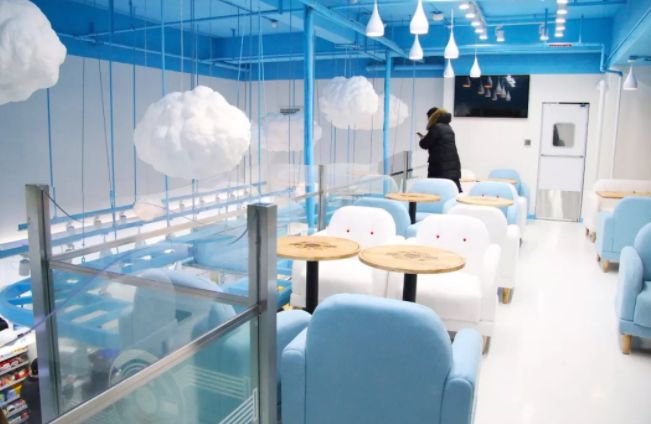 这家主题店整体设计以 B 站用户熟悉的蓝白色调呈现,十分小清新。店内装饰、员工制服到食品包装,均为特殊定制,让人一不小心以为误入二次元空间。