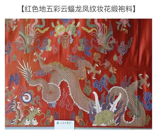 而刺绣的主画面主要来源于“红色地五彩云蝠龙凤纹妆花缎袍料”上边的内容。