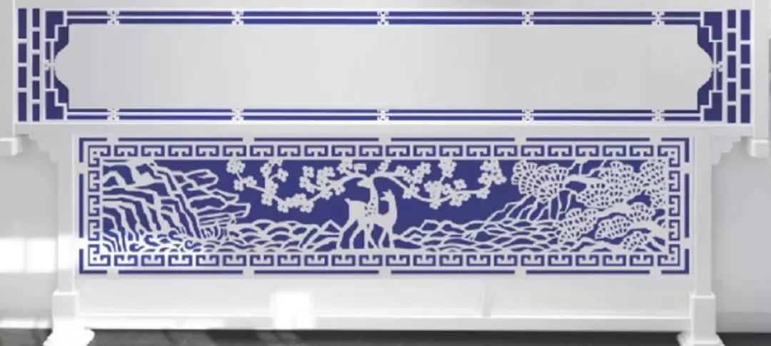店内挡板采用镂空雕刻技术,将山川,劲松,瑞鹿元素相结合。选用香盒镂空雕刻工艺,哨鹿图中的山川为低,劲松为辅助装饰,再加上同春杯上瑞鹿貌似鹿角生枝的感觉,设计而成。
