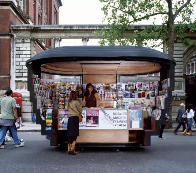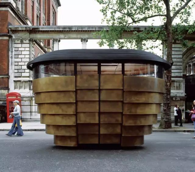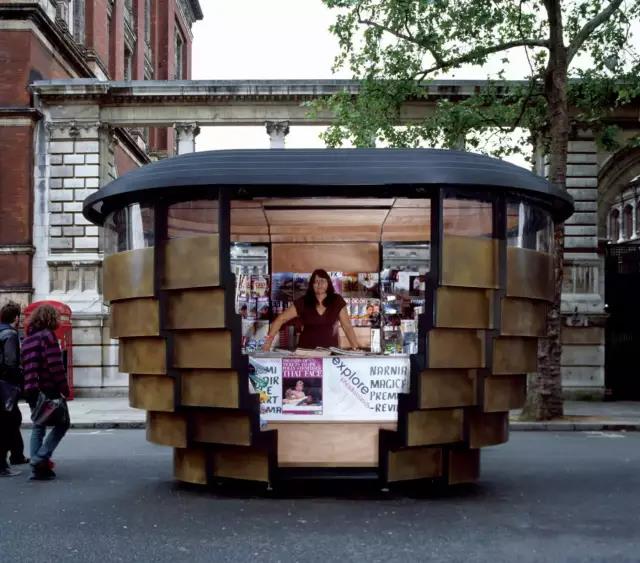 这是一个采用大量黄铜材料打造而成的创意报刊亭,该建筑的开合形式非常灵活,阶梯状推拉门同时还能放置报刊,兼具趣味与功能性,给人一种非常新奇的感觉。