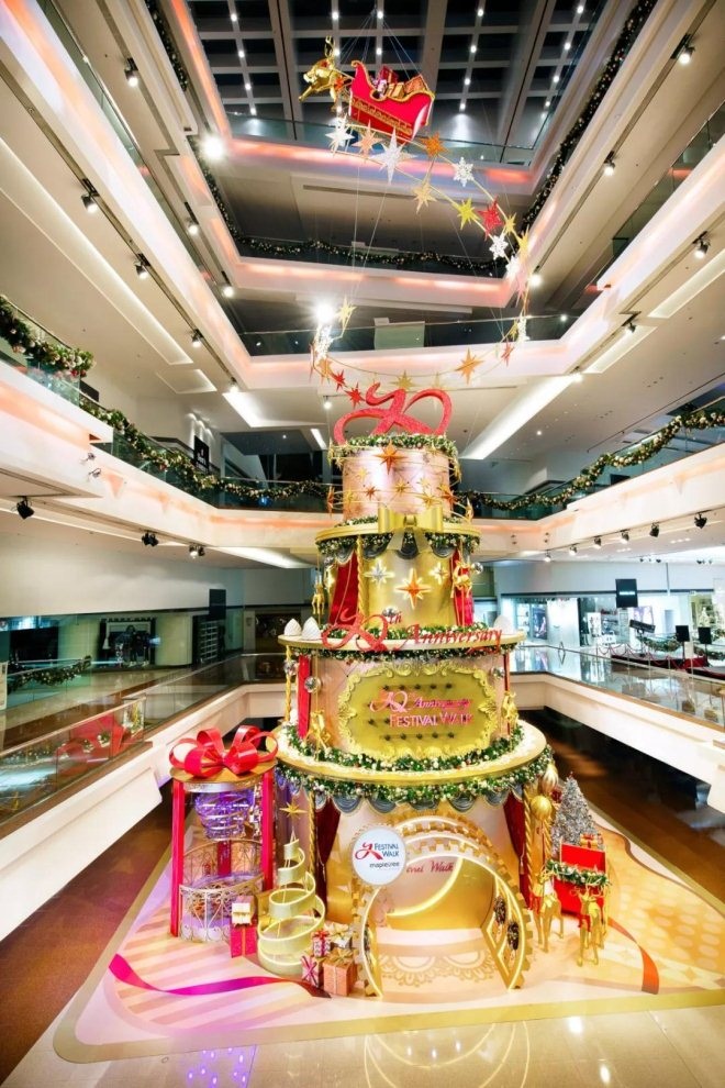 恰逢又一城20周年庆,今年商场特别策展“Merry-Go-20th”的圣诞主题活动,以生日蛋糕为圣诞树,有4层楼高,高13米的生日蛋糕树被点亮。蛋糕上配以仿照Merry-Go-Roun的金鹿作装饰,顶部更特别装上巨型红色20周年标志,闪耀全城。