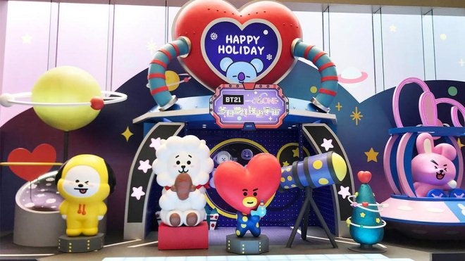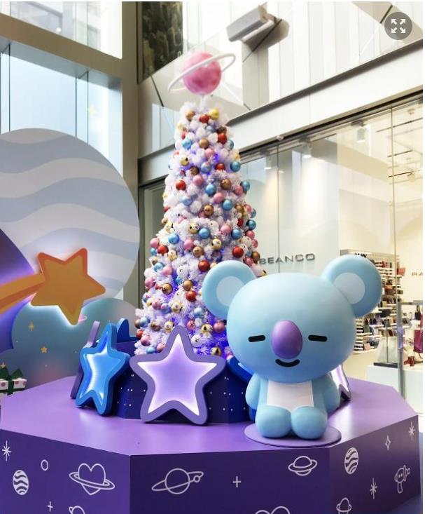 4.5米高的“宇宙闪亮圣诞树”,树上挂满家限定珍藏版BT21 MEETS The ONE圣诞挂饰;中庭变身成宇宙圣诞基地,5.5米高的心心造型宇宙基地前有TATA和RJ以及COOKY的梦幻宇宙飞船。