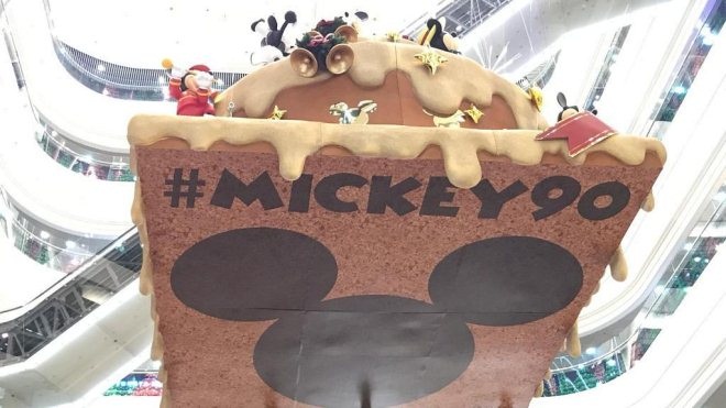 10米高巨型米奇蛋糕悬挂于时代广场2层中庭半空,蛋糕上有多款米奇造型,会挂着鞋油Happy Birthday Mickey及Merry Christmas的丝带,蛋糕底部仲印上米奇图案#Mickey 90。