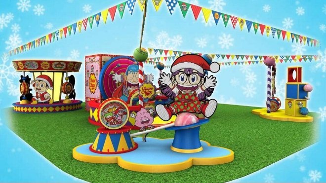 其中东港城场内设有5大梦幻打卡热点,诸如6米高Chupa Chups x DR SLUMP ARALE小云珍宝珠喷泉、4米高IQ博士珍宝珠圣诞树、宇宙大王美食车、傻瓜超人巨型珍宝珠扭蛋机、草菇小姐旋转摩天轮。