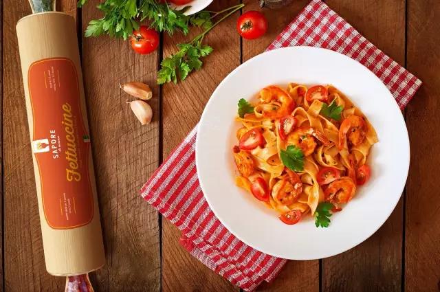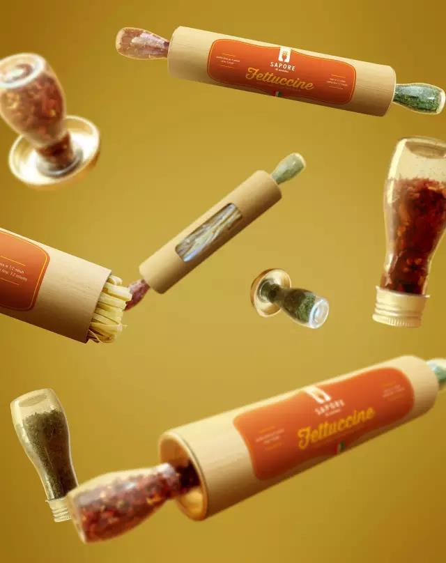 巴西设计师 Breno Cardoso 为意大利面品牌 Sapori Di Nonna 设计了一款擀面杖形状的包装。包装中部的透明的材质,能够看到手工面条的形状。