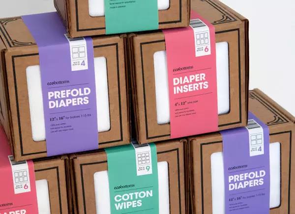 首先,这款尿布与常见的纸尿裤不同,是由布制作的。尿布、尿布衬垫和棉花擦拭打包在同一大小的正方形纸箱,使用彩色标签来区分这三个产品。
