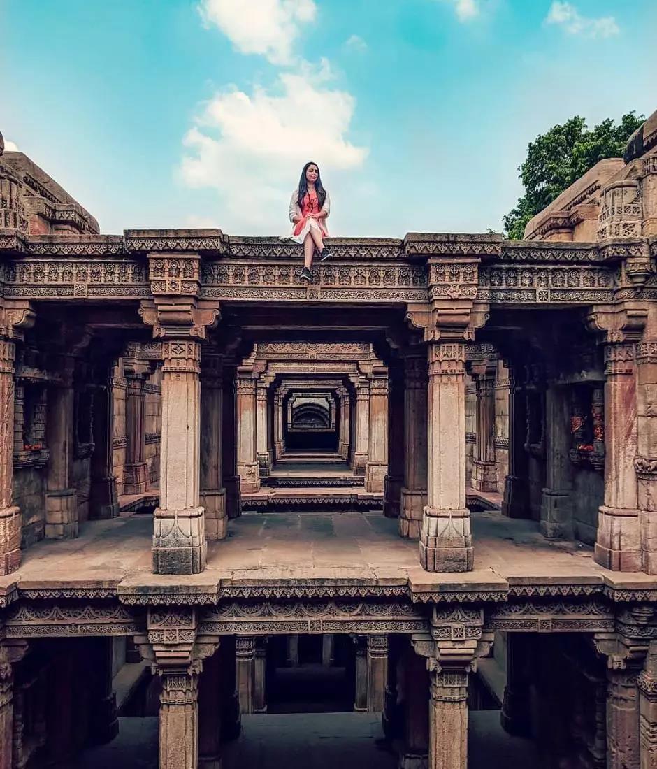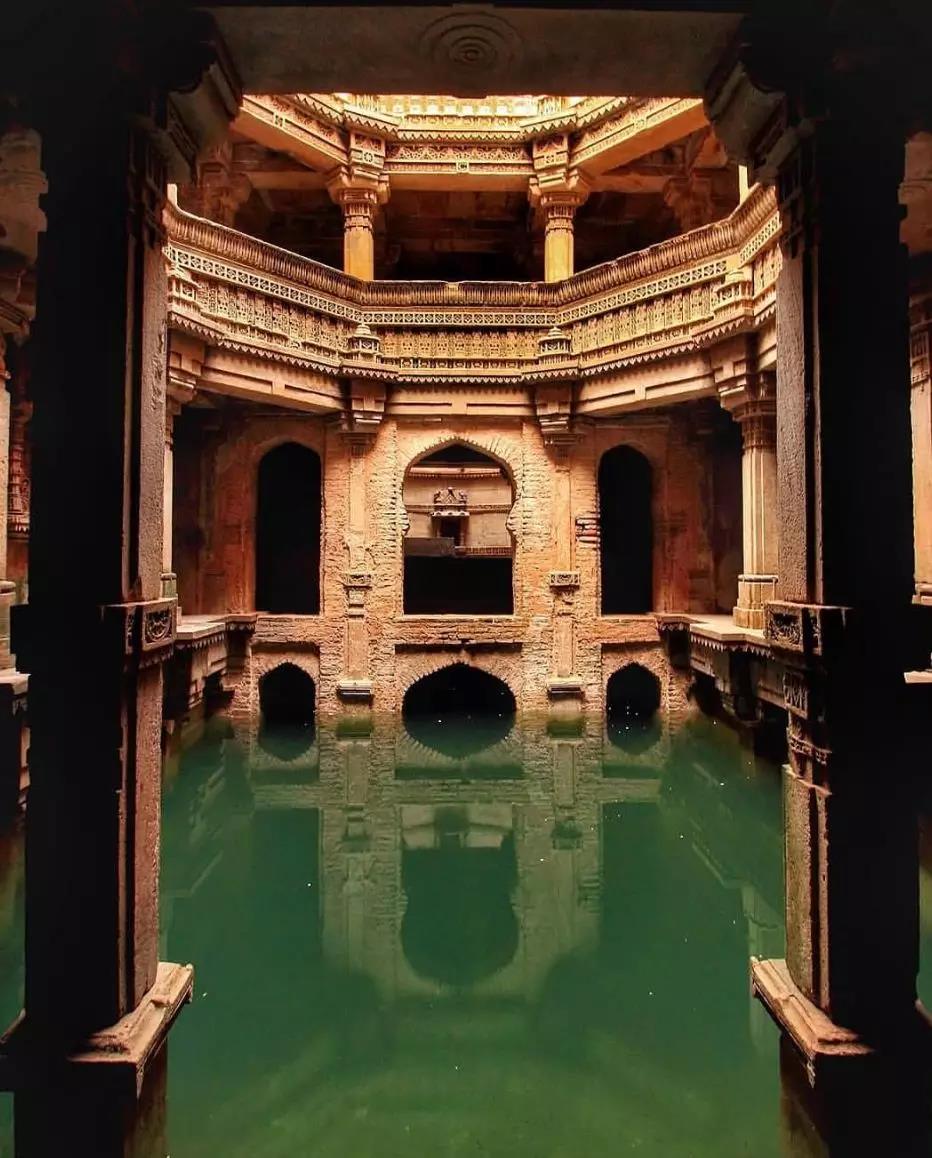 阿达拉杰阶井是穆斯林国王穆罕默德·巴格达为皇后所修建,有五层深,建筑由上而下的建筑延伸,很好的解决了底层的采光,通风等问题。阶井达到地下水的深度,以平衡水平面季节性的波动。