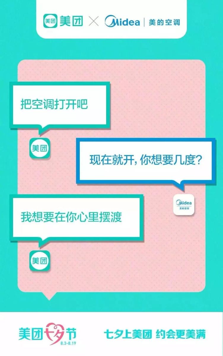 同样擅长土味情话的还有美团,七夕不仅让他搭上了美的,还搭上了微视。