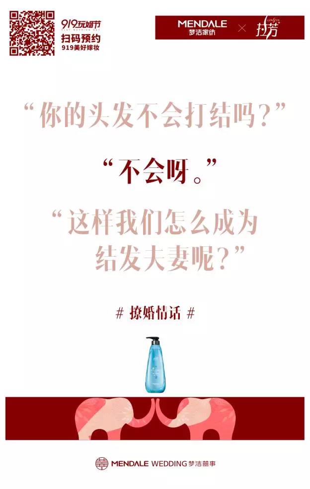 只要919元,婚庆套件全部拿回家,结婚不贵,结婚很美。919元的“一条龙”服务,不仅有拉芳洗发水、优信二手车、猫眼电影,还有中国联通、劲牌“不贪杯”,撩婚语录那叫一个情意绵绵、泛滥不可收拾。