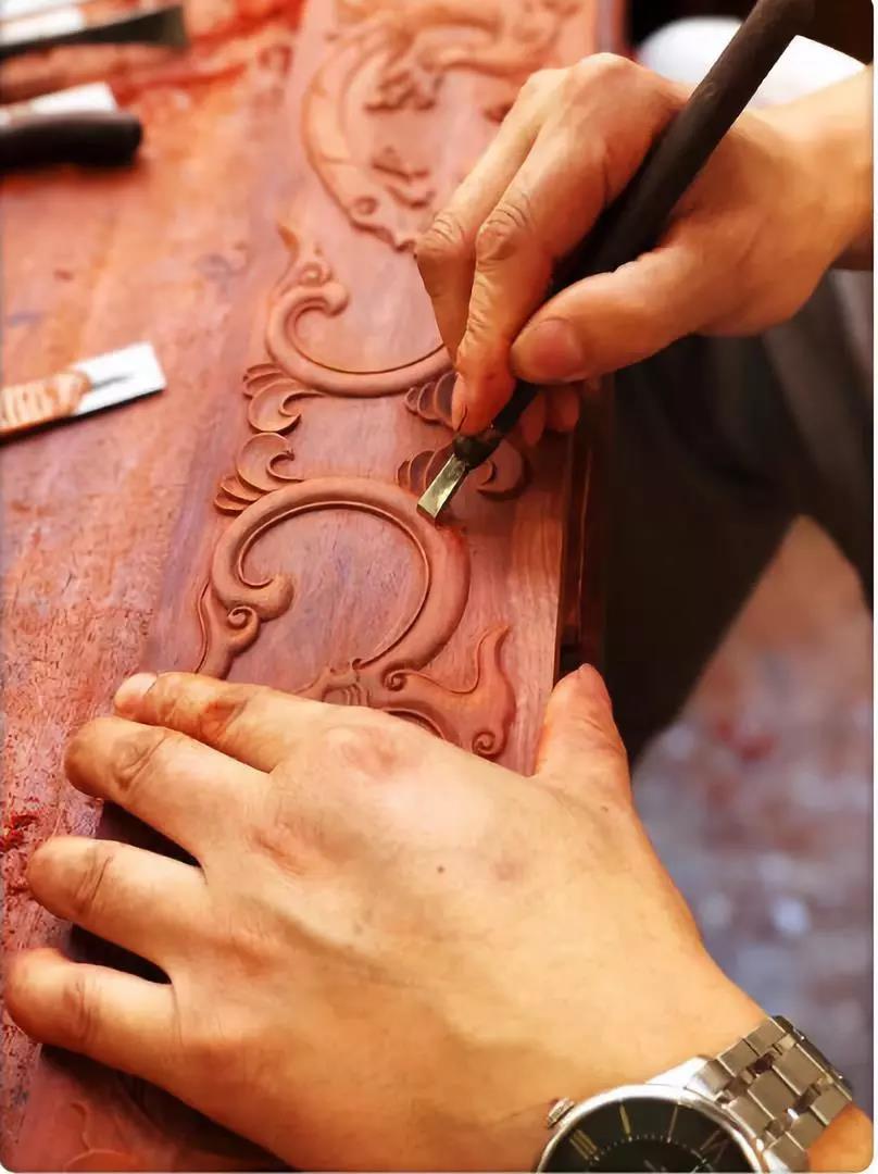 和东阳红木、仙游红木不同,苏作红木家具在材料和工艺上更讲究,更严苛,它采用传统榫卯结构,连接部位气密性良好,不用胶黏剂填充,其雕刻纹饰,也由人工雕刻而成,花纹生动活泼,与机雕纹路的呆板、无灵气迥然不同。