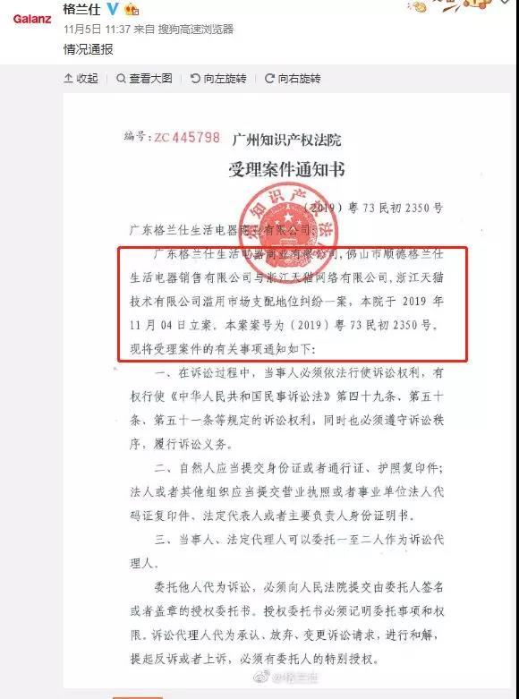 11月5日,“电器大王”格兰仕也在官方微博发布情况通报称,已于2019年10月28日向广州知识产权法院就天猫涉嫌滥用市场支配地位等相关事宜提起诉讼。今年“618”期间,因被要求在电商平台间进行“二选一”,格兰仕宣布在天猫的店铺遭遇技术屏蔽和限制流量。