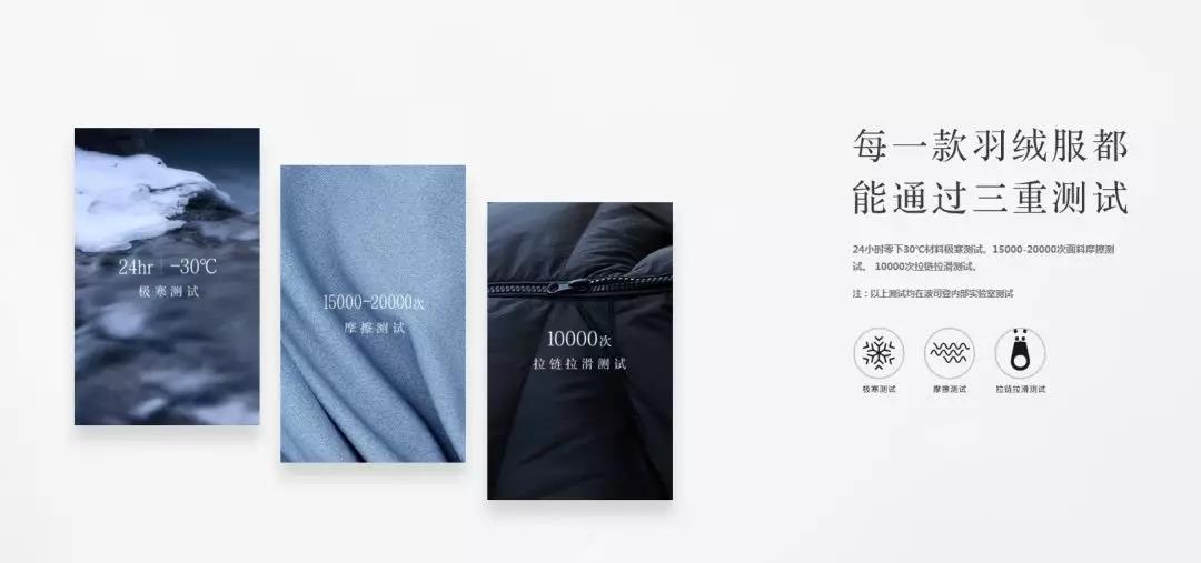 24小时零下30°C极寒测试、15000-20000 次摩擦测试、10000次拉链拉滑测试。