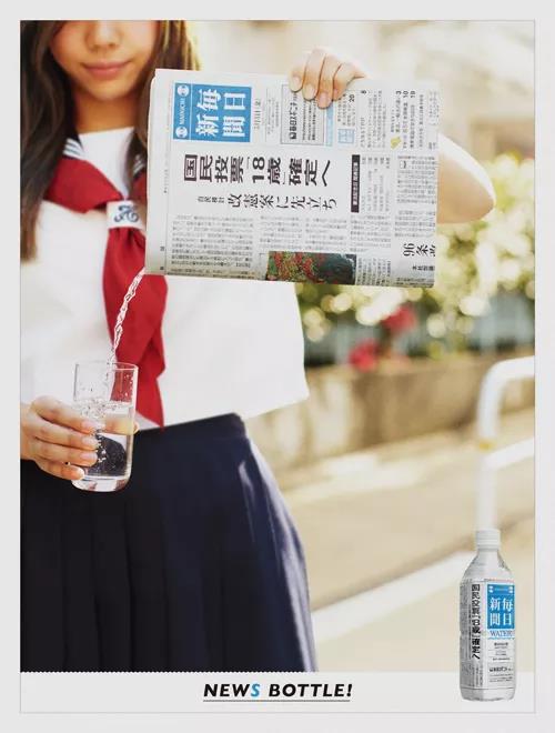 一瓶小小的矿泉水,却能让年轻人多看报、多关注时事,还能做公益。不得不说,日本人的“报纸矿泉水”创意实在是妙,值得我们学习引进!