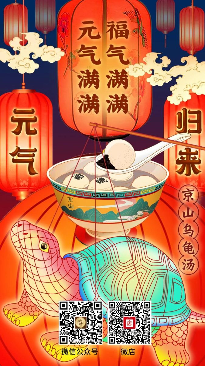 元气归来——京山乌龟汤是大众设计为盛昌水产倾心打造的一款即食消费品牌,今年元宵节我们也为客户做了一款节日海报。“龟灯”寓意长寿,“元气归来”本身就是一种祝福,精致的瓷碗上画有京山元素,整体的霓虹灯视觉,一下子就让人感受到节日的氛围。