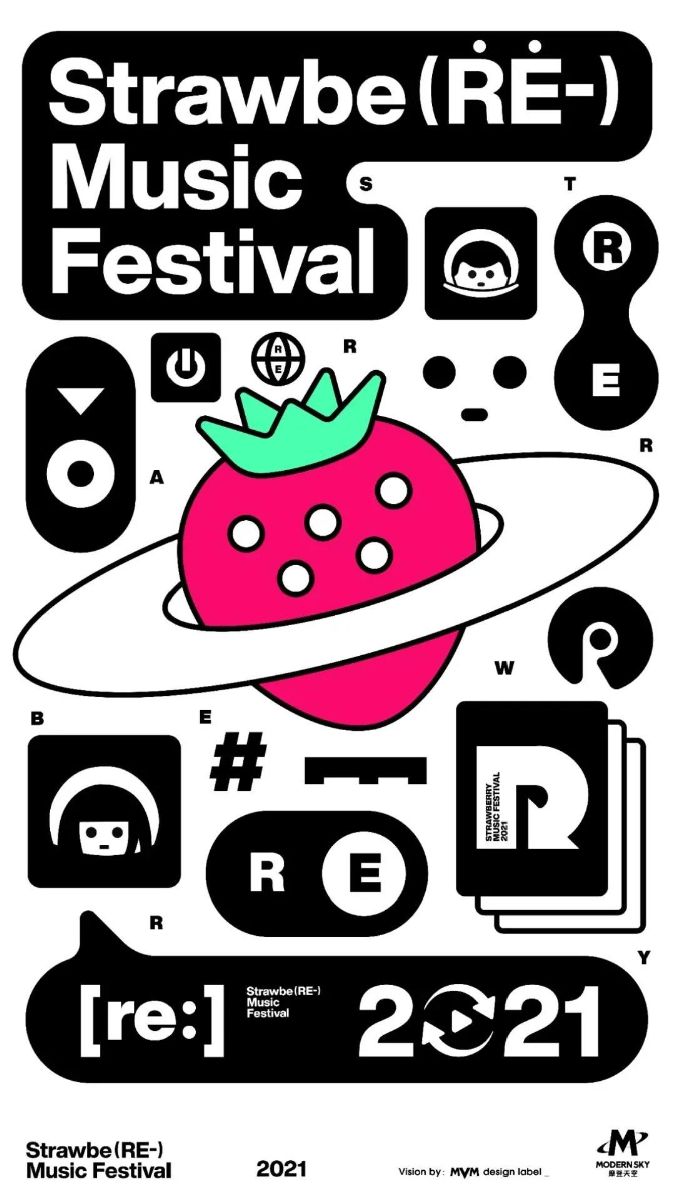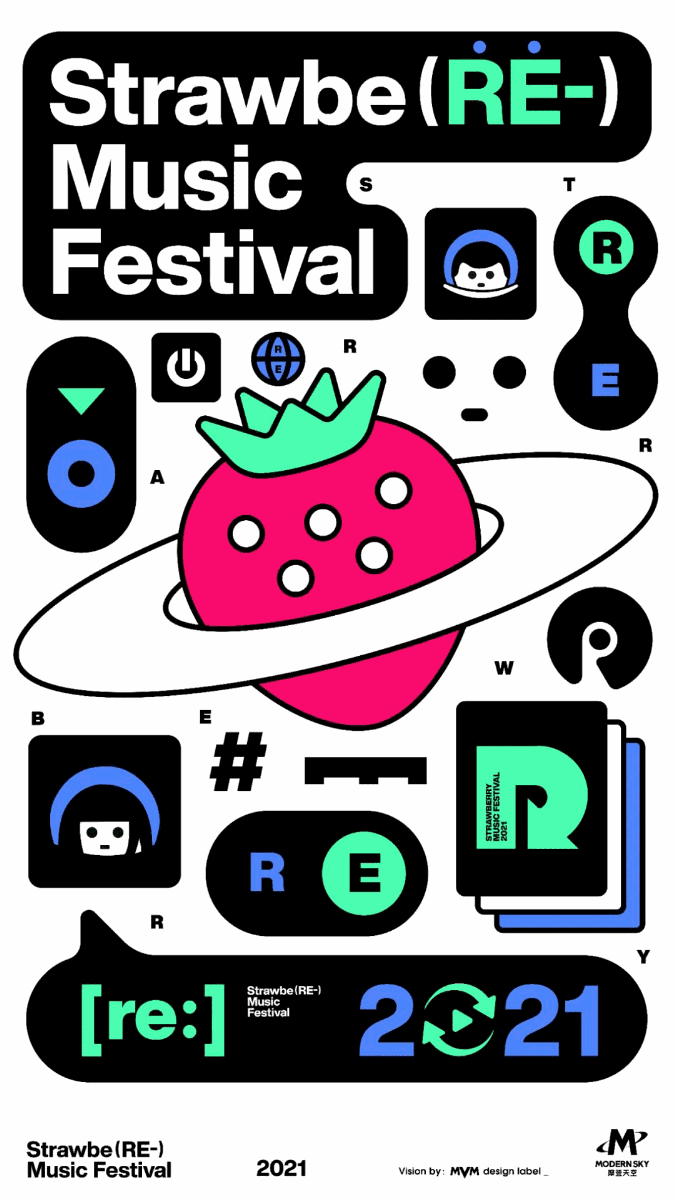 2021年的草莓音乐节的年度主题为「RE」,即是重启也是希望随音乐躁动起来压力烦恼全都得到了释放。这一次的主视觉海报更加的扁平化。