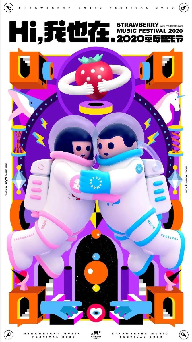 2020年的草莓音乐节的年度主题为「Hi,我也在」,其中,主视觉中采用3D特效手法与矢量插画元素相结合的风格进行设计,使太空元素呈现的画面更有个性,配色恰到好处。