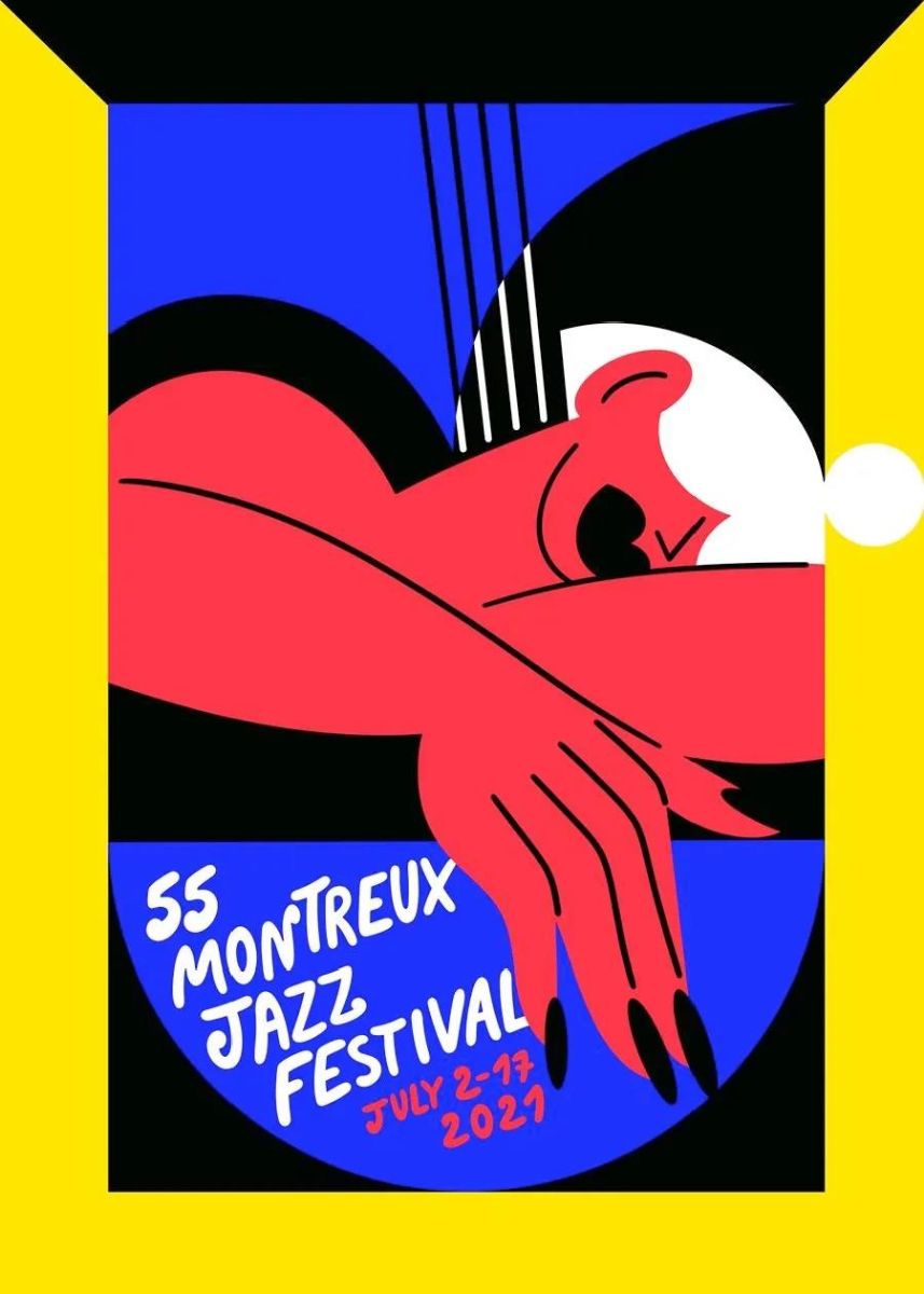 第55届的蒙特勒爵士音乐节海报是艺术家Marylou Faure设计的,他利用女性身体曲线、嘴唇的起伏特征和乐器的几何形式做了结合。这种想法让画面显得色彩鲜艳,内容框架上更具有条理性。