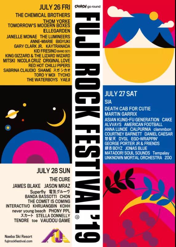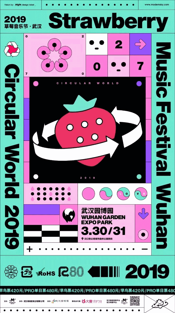 2019年的草莓音乐节的年度主题为“循环世界”,以环保为核心理念,色彩略有调整,并加入了太空元素。
