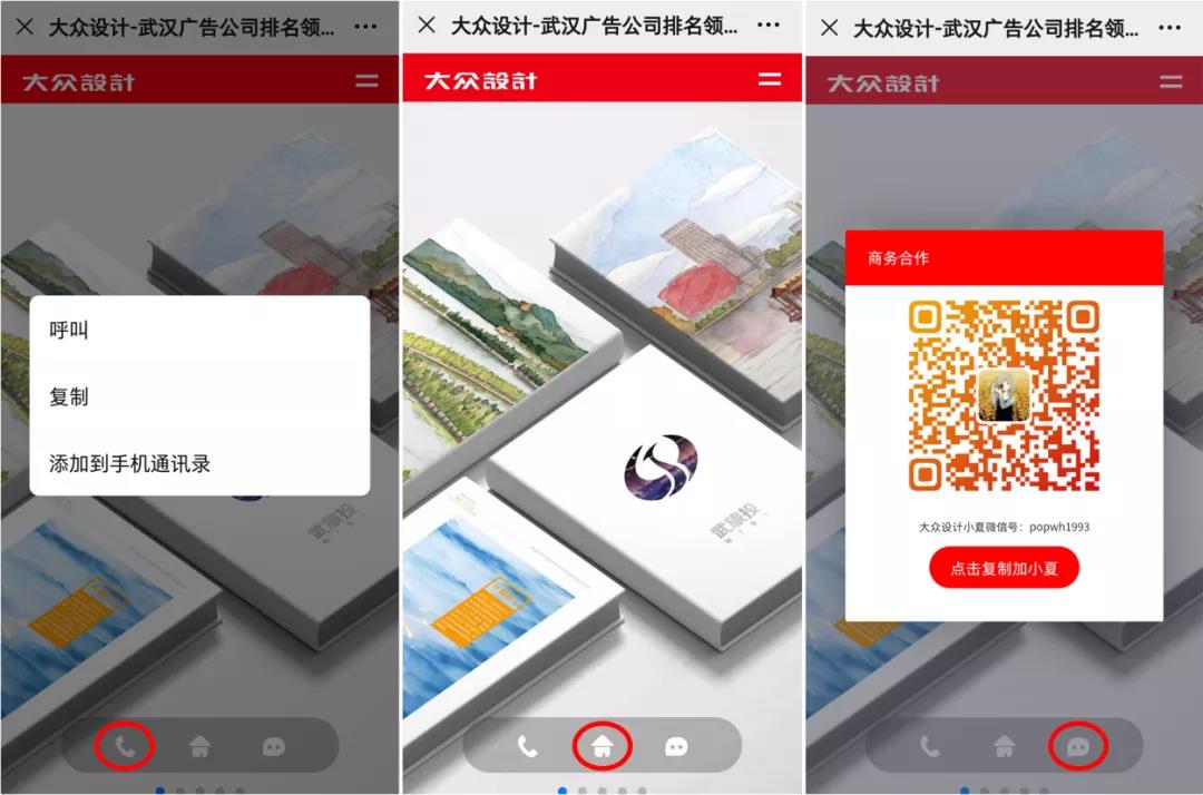 打开链接后,在任意页面您都可以看到底部悬浮的导航栏。点击左侧的电话按钮,可以一键给大众设计拨号来电;点击右侧的消息按钮,会弹出大众设计官方客服小夏的微信二维码和账号,两种方式便捷添加,7*24小时随时在线。