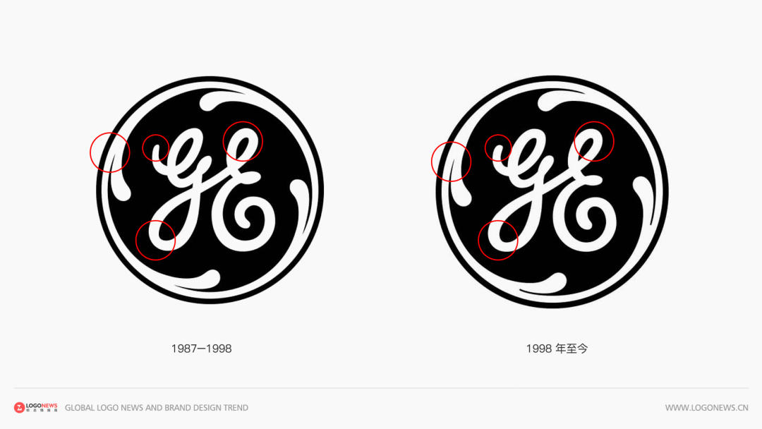 1987年,通用电气邀请知名设计公司 Landor 的设计师对其LOGO进行微调,将环绕在圆圈周围的四个弧线更改为水滴状,减少字体部分笔画的螺旋幅度,使字体的结合更流畅自然。