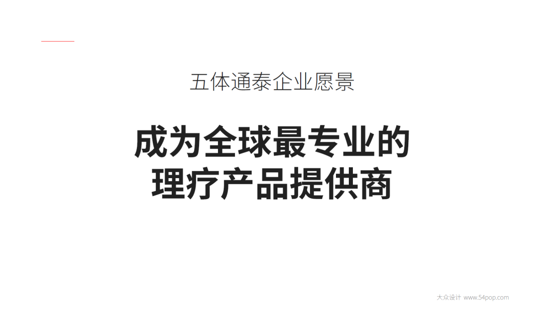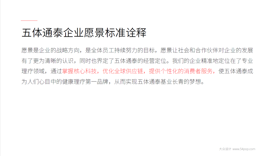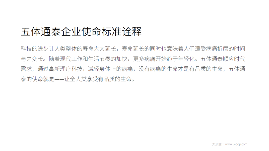 五体通泰是我们服务的一家互联网时代全新的理疗产品服务平台,该平台几乎全面覆盖了人体保健、治疗所需的理疗产品及相关服务。经过多次的走访及调研,我们为企业撰写了使命与愿景。