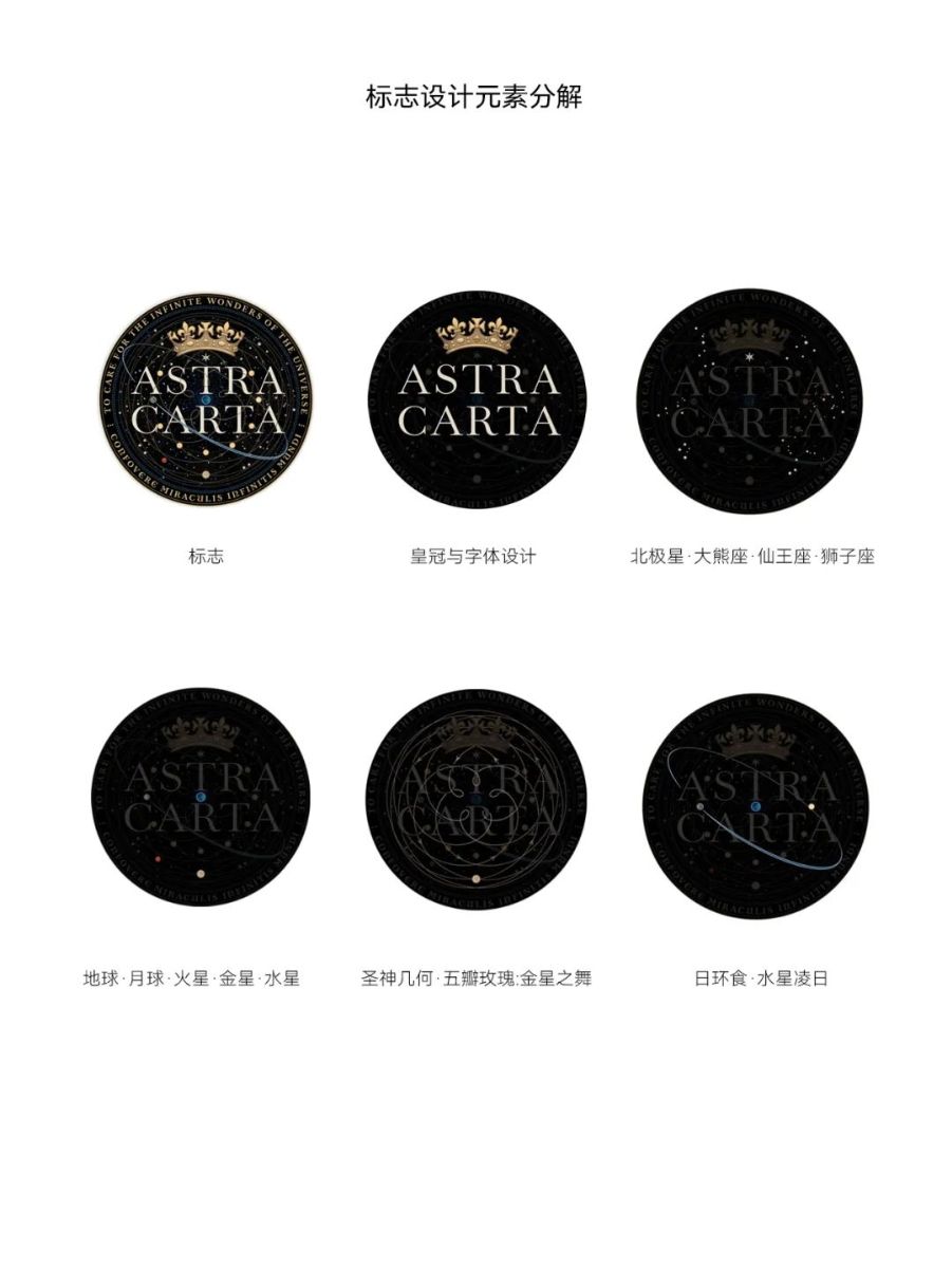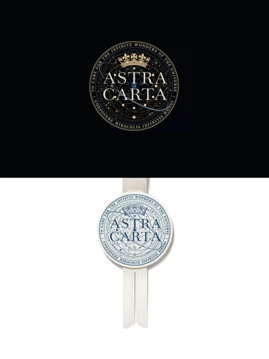 “Astra Carta”标志的灵感来自于地球、月球、金星、火星、水星、北极星、大熊座、仙王座、狮子座、日环食等元素和神圣几何学 。标志中心的蓝点代表地球,而星座、太阳、月亮和金星等围绕着它运行。