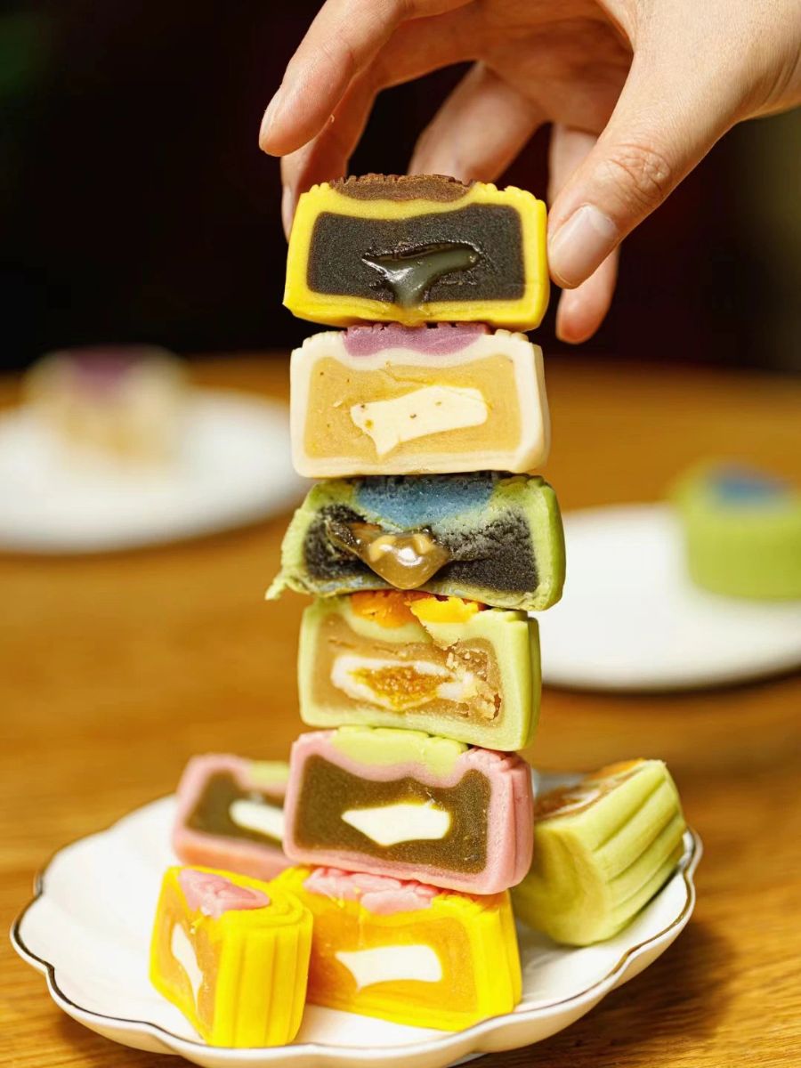 6个颜色对应6种情绪,心平气和吃绿色、有点小emo吃蓝色、精神亢奋吃黄色,总之就是要——对症吃月饼。月饼的口味也是紧跟潮流,传统的黑芝麻味、奶黄味除外,还有时下流行的生椰拿铁味、桂花乌梅味等。
