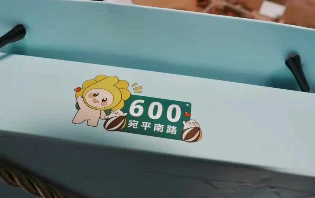 月饼礼盒手提袋为淡蓝色,中间是卡通IP形象——象征“阳光下向日葵”的小葵,脸盘是数字“6”的设计,还有两颗小瓜子,代表“00”。礼盒主图则为宛平南路600号logo的变形图,不同线条勾勒出“宛平南路600号”。