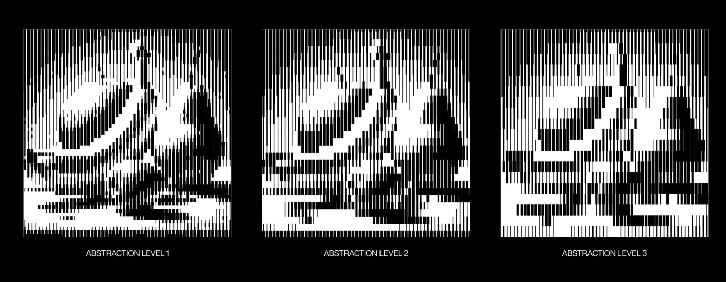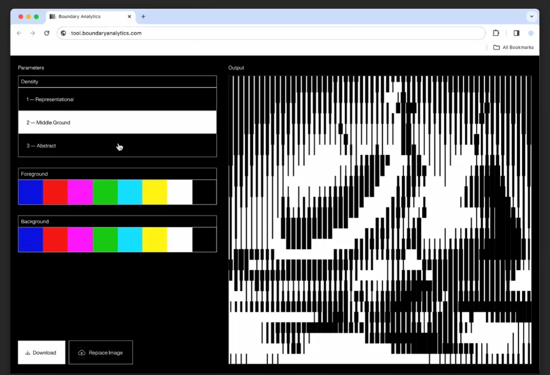 设计师还特别设计了一个自定义图形生成器,可创建品牌特色图像和纹理。用户上传任何输入图像,在三个数据之间切换,从品牌调色板中选择两种颜色作为前景和背景。