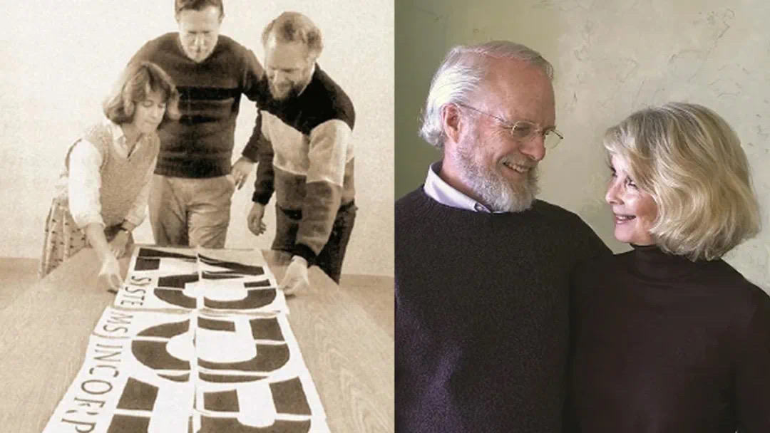 图左为1982年,玛瓦·沃诺克向Adobe公司联合创始人查尔斯·格什克(Charles Geschke)(中)和约翰·沃诺克 (John Warnock)(右)展示Adobe标志。图右为约翰·沃诺克 (John Warnock)和玛瓦·沃诺克夫妇。