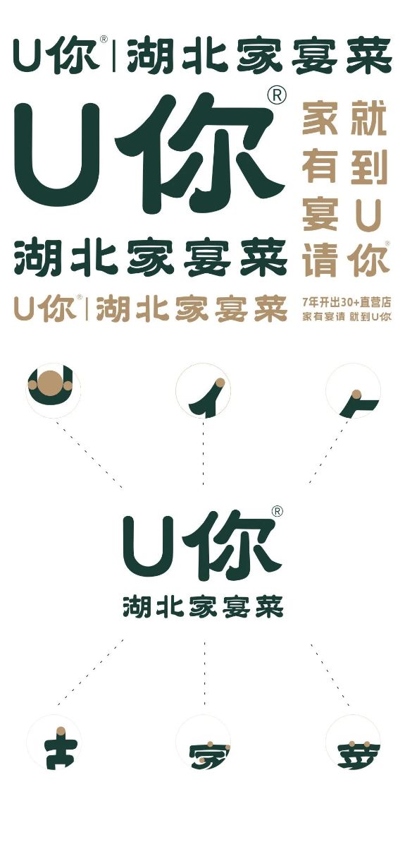 品牌原本的字体现代感比较强,整体呈现科技活泼的感受,与品牌想传达的家宴菜不符,于是我们从隶书中取宽博结构,让整体沉稳、独特,换上浑厚、有力的笔画,收尾处理的圆润可爱,使得新字体不仅体现传统隶书的质感,同时在制作招牌时更具有视觉竞争优势。